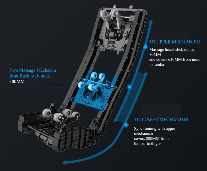 Novi dvostruki mehanizam s glatkim dizajnom vodilice, pomno prati krivulju ljudskog tijela i smanjuje buku motora tijekom rada. 6 razina prilagodbe masaže za vrat, ramena, leđa, struk, bokove i bedra, pružajući iskustvo masaže s potpunom pokrivenošću.